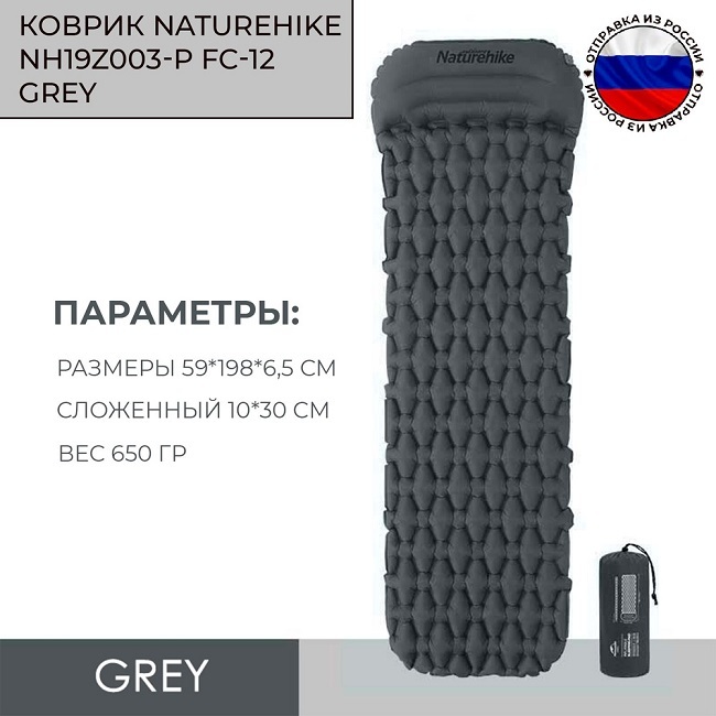Коврик туристический надувной Naturehike FC-12 одноместный, с подушкой, серый NH19Z003-P купить по цене 3 661 ₽ с доставкой